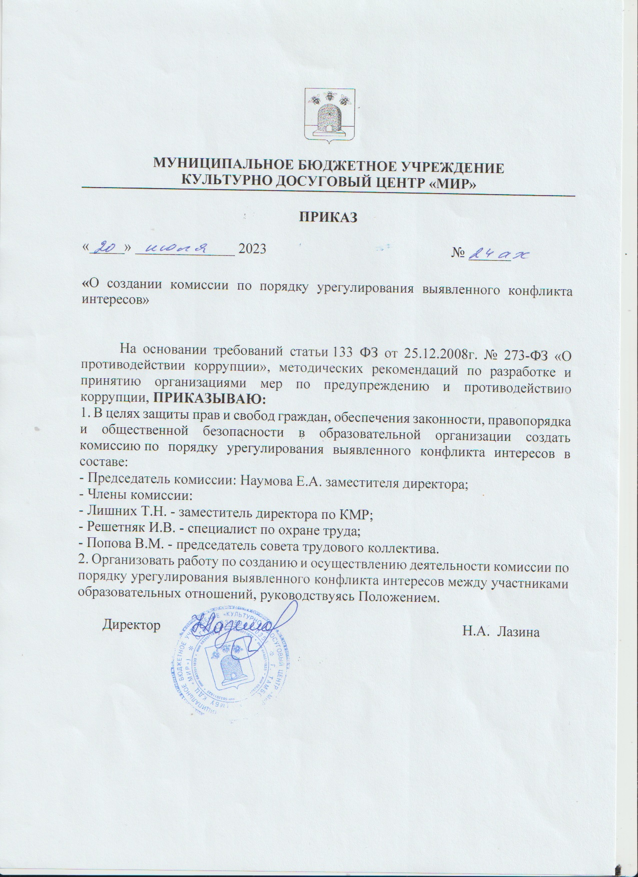 ПРИКАЗ о создании комиссии по порядку урегулирования выявленного конфликта интересов