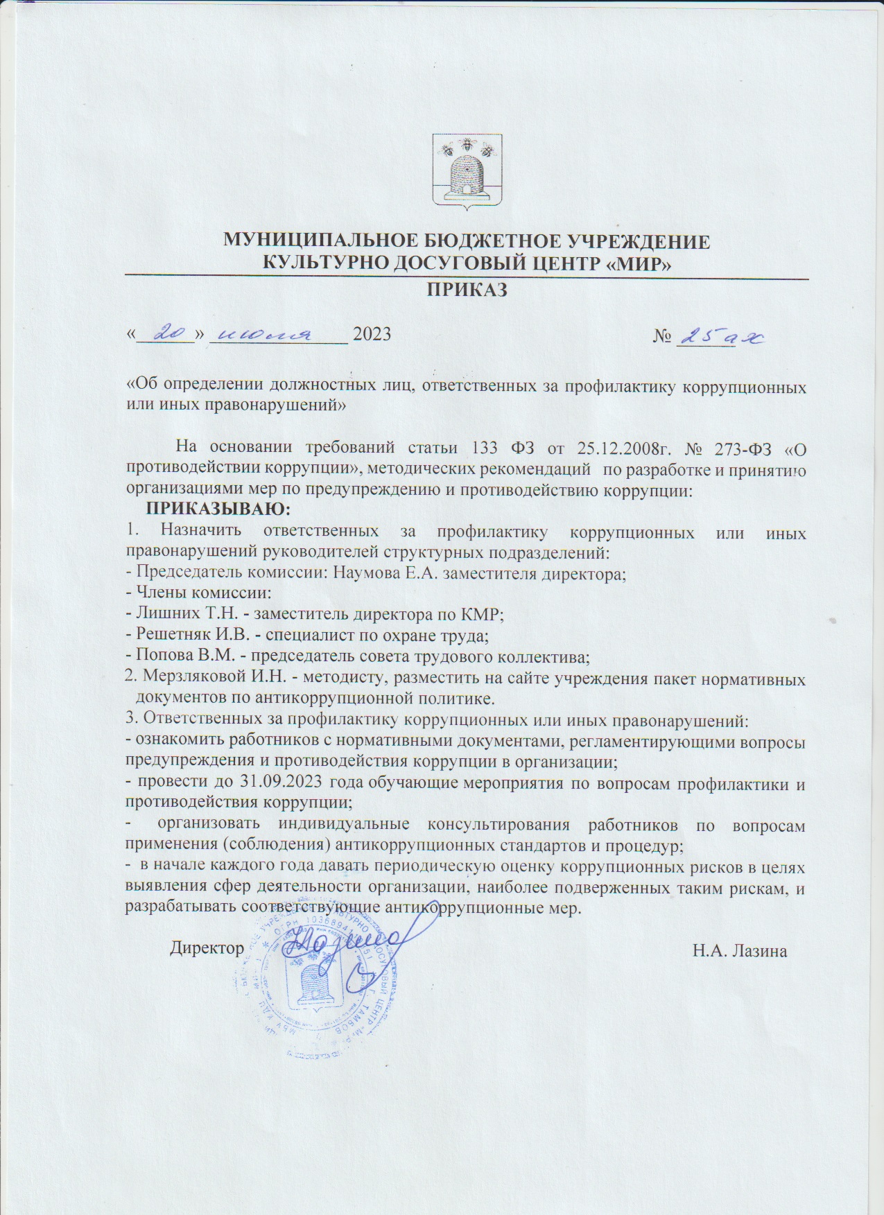 ПРИКАЗ об определении должностных лиц, ответственных за профилактику коррупционных или иных правонарушений