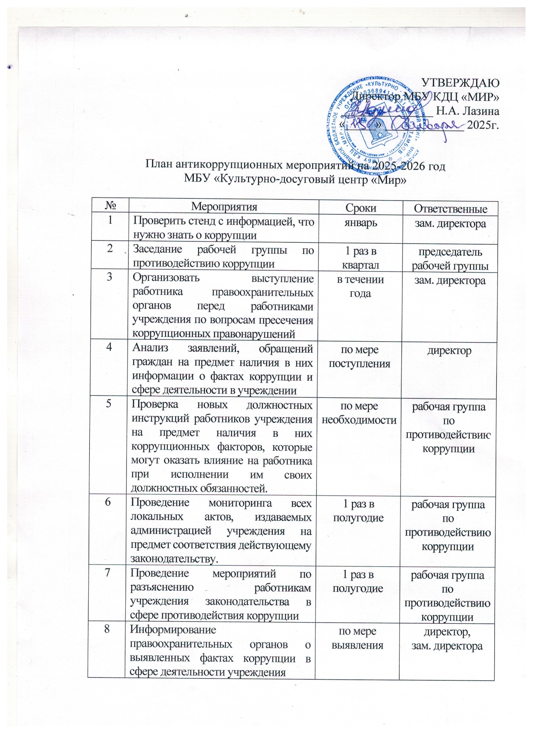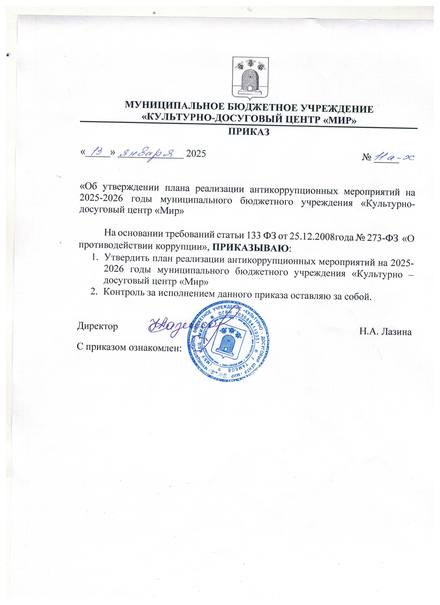 ПРИКАЗ об утверждении плана реализации антикоррупционных мероприятий на 2025-26г.г.