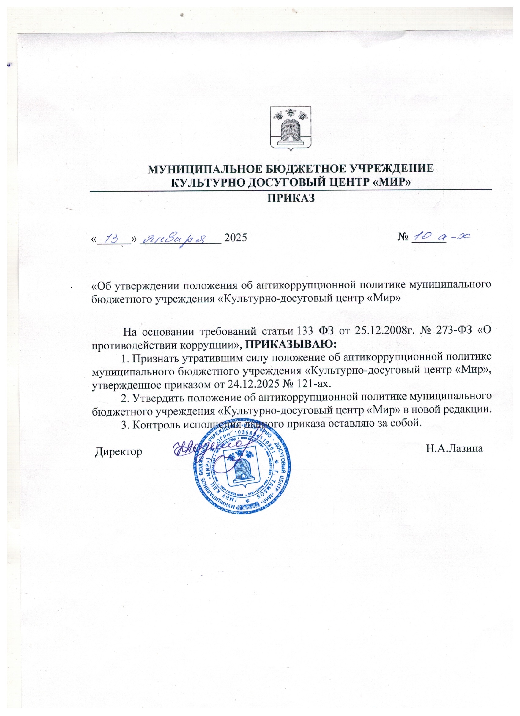 ПРИКАЗ об утверждении положения об антикоррупционной политики