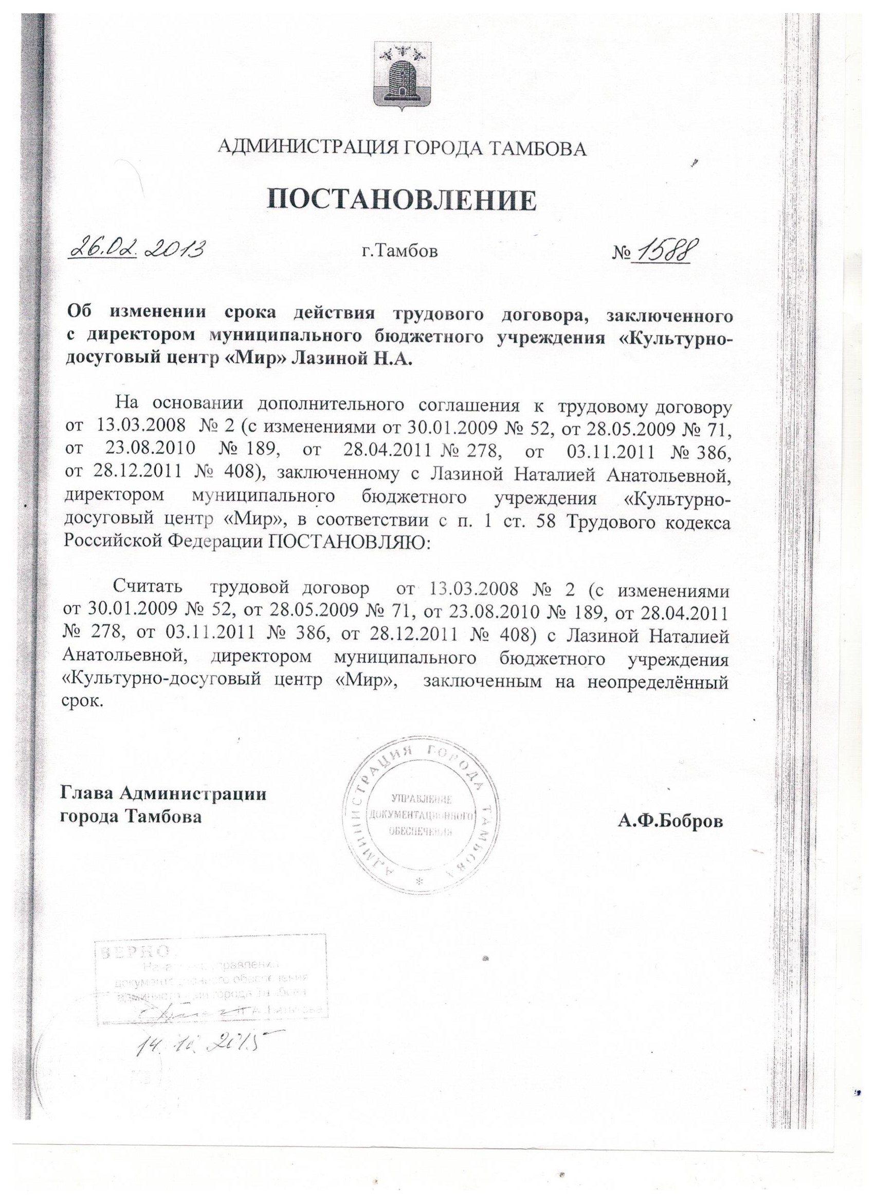 Постановление № 1588 об изменении срока трудового договора заключенного с директором от 26.02.2013