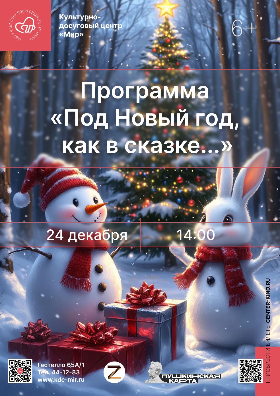 Веселый и яркий праздник, организованный творческими коллективами КДЦ «Мир» и профессиональными артистами, подарит зрителям неповторимую атмосферу Нового Года. Мероприятие включает красочную концертную программу, интерактивные элементы и новогодние сюрпризы. Творческие коллективы КДЦ «Мир» и приглашенные артисты исполнят праздничные песни, проведут веселые танцевальные флешмобы и игры. В программе прозвучат такие песни, как «Белая метелица», «Три белых коня», «Снежинка». Хореографические коллективы исполнят задорные танцы «Зима-холода», Снег-снежок» и другие.