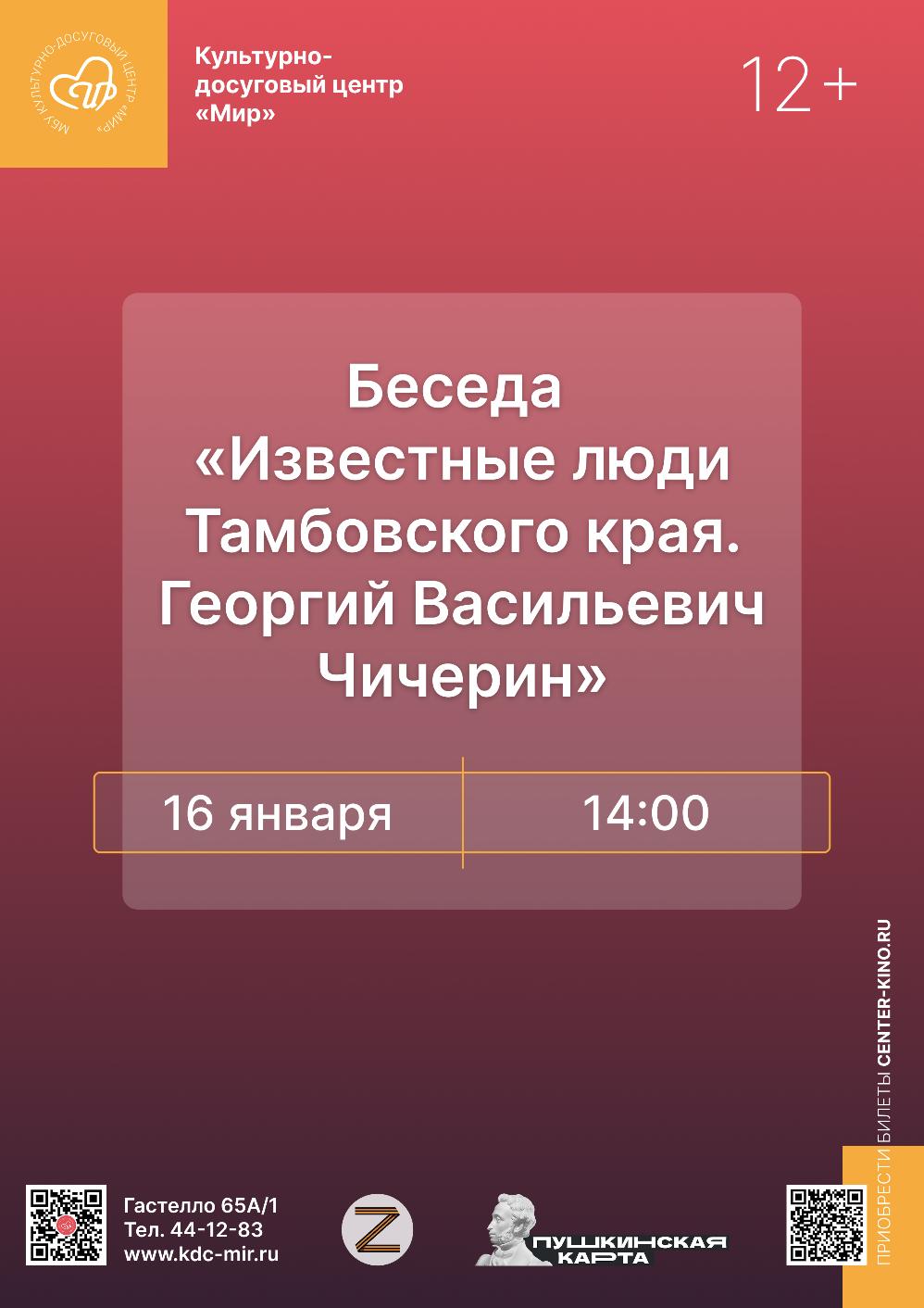 Георгий Васильевич Чичерин – уроженец Тамбовского края, одна из самых ярких личностей начала XX века, первый народный комиссар иностранных дел РСФСР, человек энциклопедических знаний, блистательный знаток мировой культуры и истории, владевший несколькими языками. Его вклад в становление советской дипломатии и укрепление международного авторитета страны невозможно переоценить. Участники мероприятия узнают о жизненном пути Чичерина, его тамбовских корнях, дипломатической деятельности, а также о влиянии личности Чичерина на формирование внешней политики России в сложнейший исторический период.