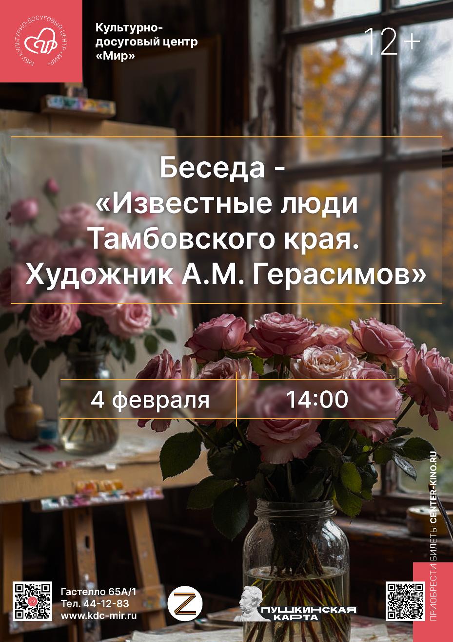 Александр Михайлович Герасимов – выдающийся живописец, народный художник СССР, уроженец Тамбовского края. Его творческое наследие включает сотни картин, среди которых известные полотна исторического и портретного жанра, пейзажи и натюрморты. Герасимов оставил яркий след в отечественном искусстве XX века, сумев соединить академическую школу и личное художественное видение. Во время беседы участники: познакомятся с жизнью и творчеством А.М. Герасимова; обсудят его вклад в развитие изобразительного искусства; увидят примеры наиболее известных картин мастера; узнают о значении Тамбовского края в формировании творческого пути художника. Мероприятие позволит глубже прикоснуться к истории и культуре родного региона через личность великого земляка.