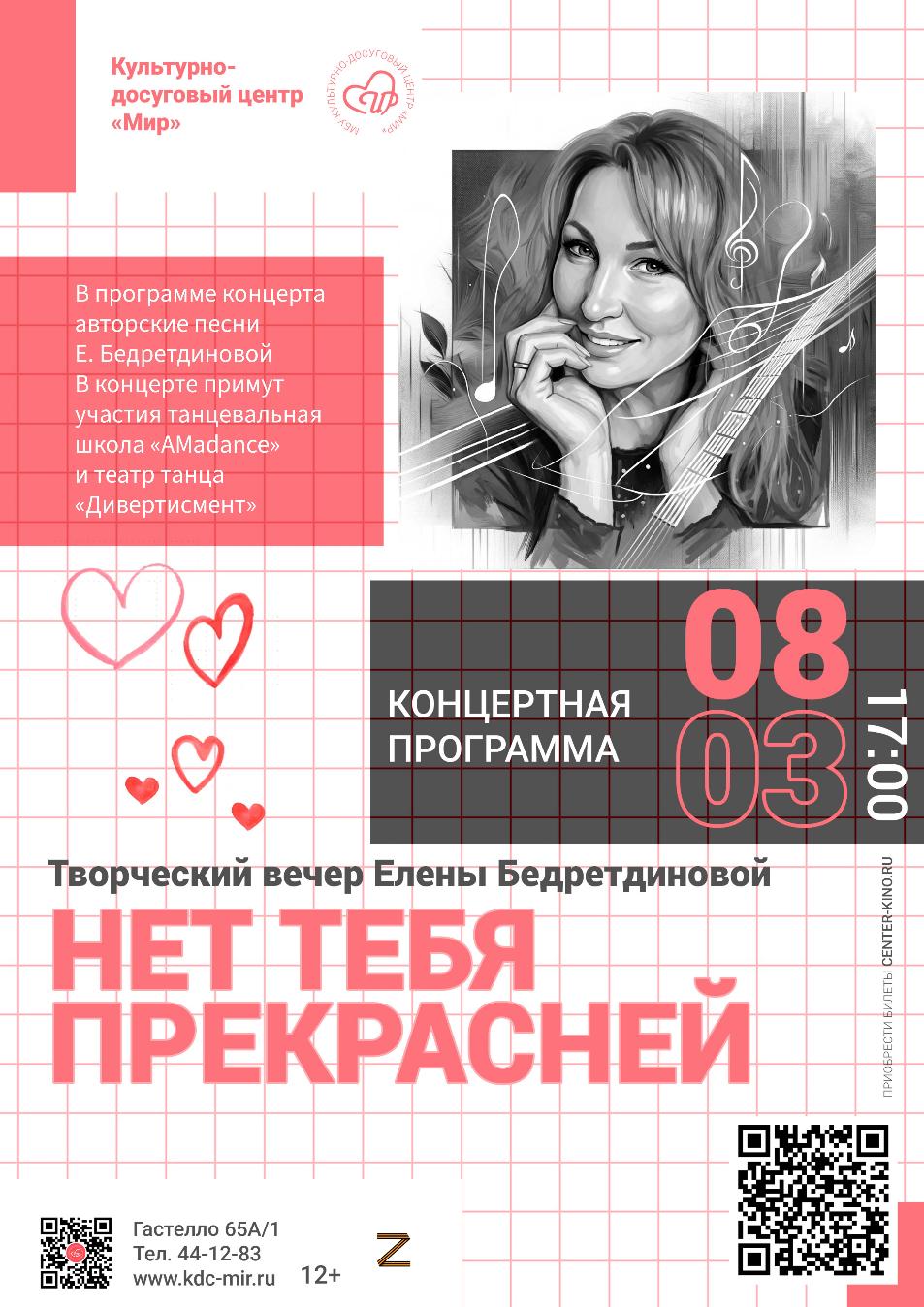 Творческий вечер Елены Бедретдиновой "Нет тебя прекрасней" — это концертная программа, насыщенная произведениями, проникнутыми любовью к родине и лирическими мотивами. Елена представляет публике собственные сочинения, отражающие её искреннее отношение к жизни и стране. Концерт включает также известные музыкальные композиции, воспевающие любовь к Отечеству.